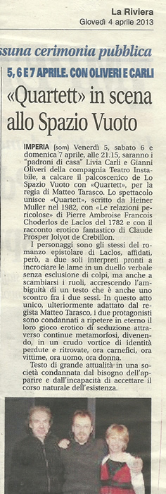 Quartett fu scritto nel 1982 da H. Müller e fu definito “una metastasi, un fiore malato” nato dal corpo classico del romanzo di Choderlos de Laclos “ Les liasons dangereuses”, scritto nel 1782 alla vigilia della Rivoluzione francese